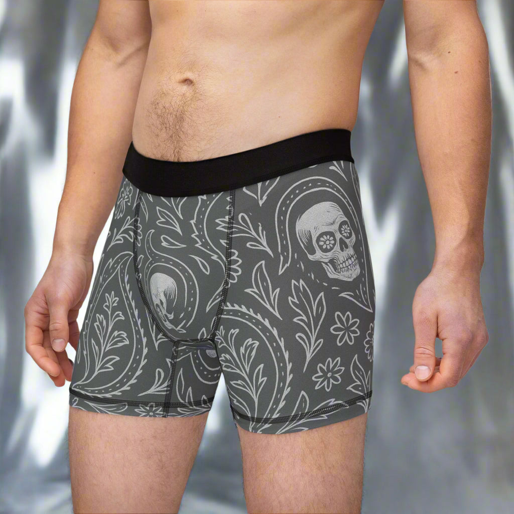 Bold in detail. Smooth in feel. These all-over print boxer briefs feature our signature skull and zinnia paisley design in a crisp white and dark grey palette. Built with breathable antimicrobial fabric and a comfortable stretch fit, they deliver performance and streetwear aesthetic in one. Whether worn under layers or on their own, this piece is a lowkey essential for the bold.